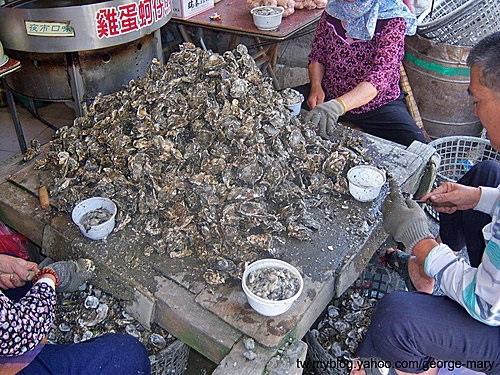 芳漢路上美食街會看到這樣剝蚵的景象,因為這裡出產全國最有名的珍珠蚵,當地有一句話說~男人採蚵,女人剝蚵~