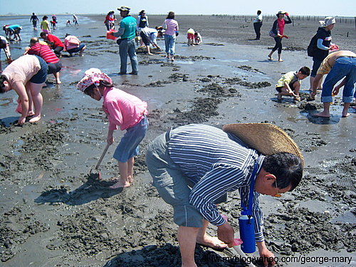 前面這一位包頭穿運動衣的是我們這一車的司機阿伯,正在幫小朋友耙蛤蜊