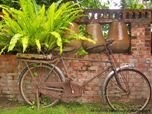 阿公ㄚ車,後面那個酒甕好像在小高家的很像,921時他在埔里請貨車載好幾個回來,現在放在樓梯間擺著養蚊子