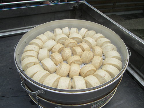 老闆準備要送饅頭去,特別說這ㄧ車的饅頭不能拿,要的話前面那裏的蒸籠還有在蒸,到那邊去等一下就有得吃了