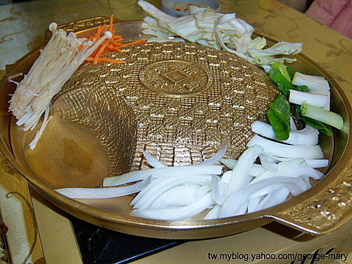 來吃韓國料理不點個銅盤烤肉,那算有來吃韓國料理阿!有跟我一起來的,這個都是我叫的菜,今天來個豬肉的,銅盤的四周有高麗菜、洋蔥、青蔥、紅蘿蔔絲、金針菇,加上高湯就可以開火烤肉了