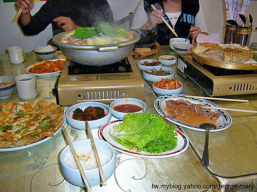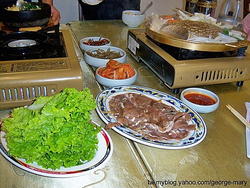 你看多鮮豔的色相呀!紅配綠ㄡ!看起來是不是讓你食指大動呢?還有阿!那個阿仁ㄚ~竟然不會韓國烤肉ㄟ,看他那笨手笨腳的樣子真的好笑耶!還多虧我幫銅盤用湯匙加高湯,一來讓肉汁流下銅盤跟高湯結合讓湯更美味,二來肉也不會焦而黏在銅盤上,阿仁ㄚ~學起來沒
