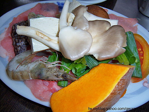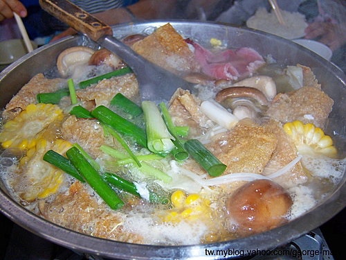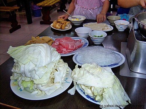 豬肉爐一份的份量,含一小盤高麗菜,當然不夠我吃,豬肉及高麗菜、冬粉、豆皮、香菇、玉米,金針菇都要來一份