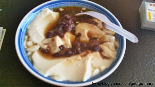 紅豆豆花,它這裡的豆花有很濃的黃豆香味,豆花顏色也偏黃,不比台南的安平豆花較白較綿密