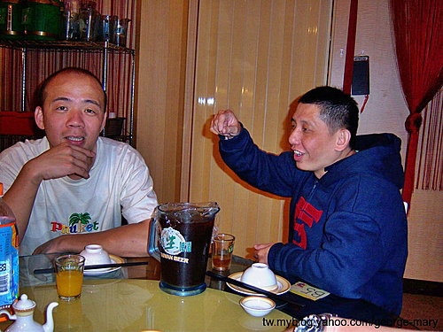 這兩個人不知道在說什麼,阿仁ㄚ~還比手劃腳的,不過從上面兩張相片可以看出用餐的人很多,但過沒幾分鐘遇到兩大車的大陸旅遊團進來用餐,那個餐廳包箱都不夠讓它們坐,都坐到外面來了