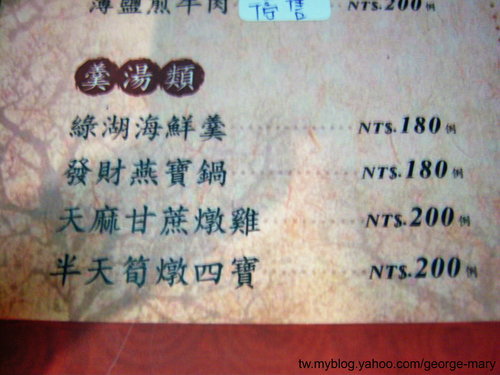 綠湖海鮮羹,大家都有喜歡的,也喝上好幾碗,阿仁ㄚ~都在旁邊跟我說這個好~這個好~,那這個好就要常出來阿,泰宏跟他說上次清水閣樓那個更好,而且那一餐是雞蛋ㄟ~請,沒想到下禮拜喝著少林寺就去廬雞蛋ㄟ~