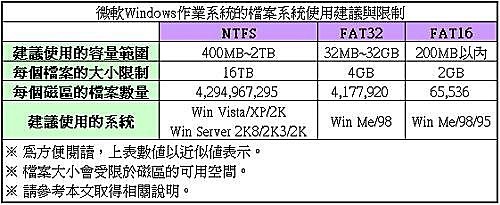 FAT16、FAT32與NTFS是微軟Windows系統常見的檔案系統格式,從下表可以快速查知這三種格式在一般微軟作業系統上使用的常見限制。
